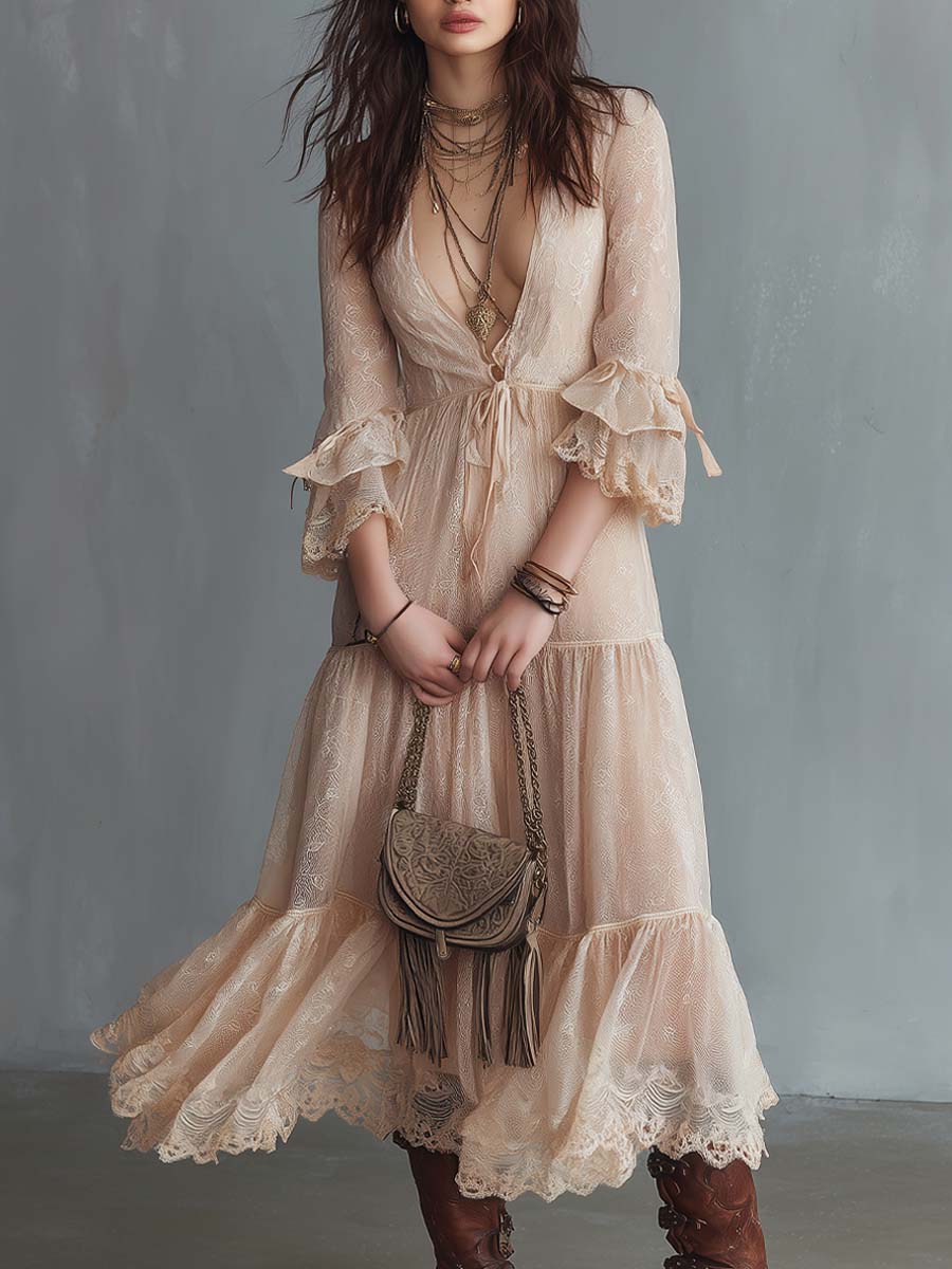 This Romantic Boho Lace Flared Midi Dress combines a soft, feminine silhouette with artisanal lace details for an effortless, vintage-inspired look. The midi-length skirt flares gently from a defined waist, creating graceful movement. A lightweight lining ensures comfortable wear while the delicate lace overlay gives the dress its romantic, bohemian character.