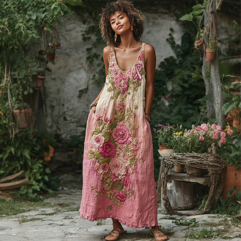 Vintage Pink Flowers Embroidered Linen Maxi Dress